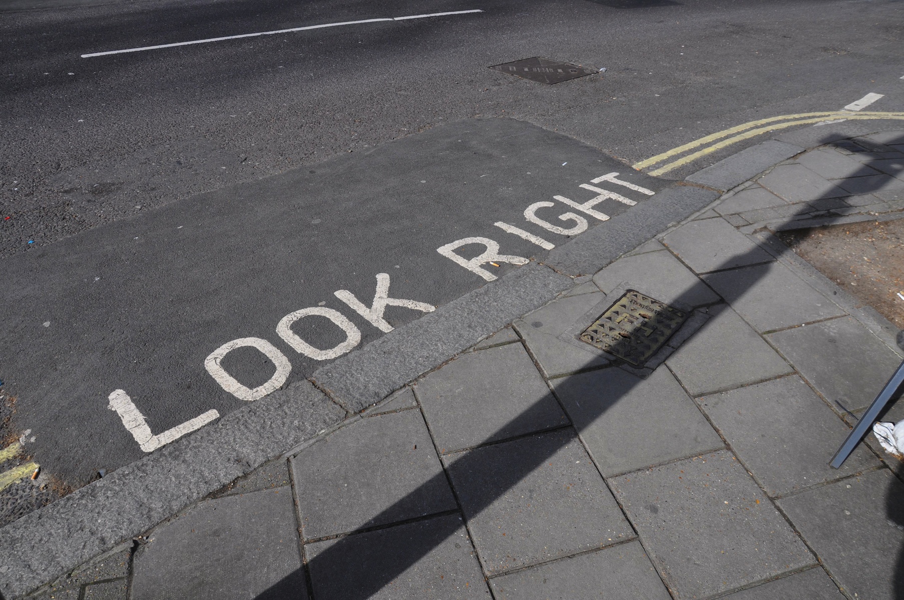 All cars are using the wrong side of road in this country. Though I’ve heard they agreed to use it this way. Because of that it’s a bit unusual to cross the road. I always forget in which direction I should check the cars first. Looks like English people have an idea, that a lot of tourists have these problems. Especially in summer. Therefore they have a mark right on the road. So the first place you have to check is not right or left, but just down. Everything is written there :)