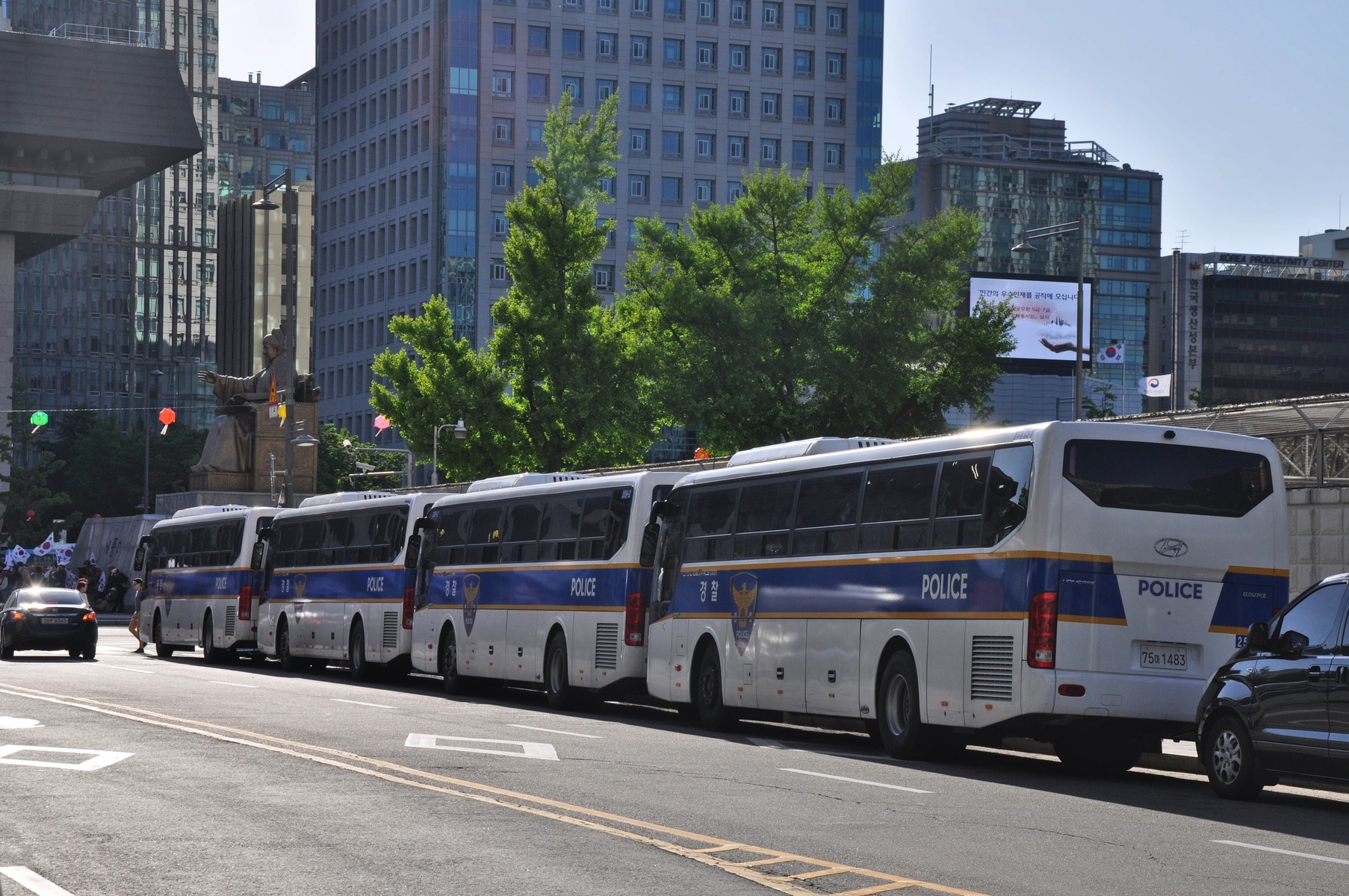 Автозаки. Полицаев много, но они никого не трогают, никакого оружия у них нет (даже дубинок), людей не крутят, никаких металлодетекторов на вход не выставляют. Кое-кому есть чему поучиться.