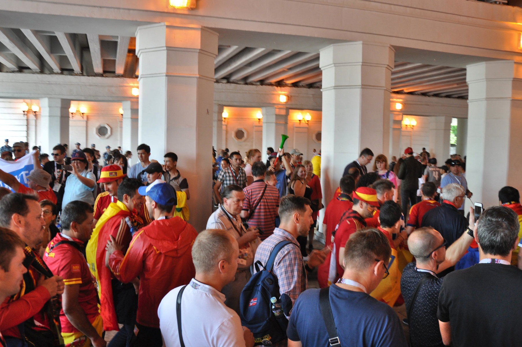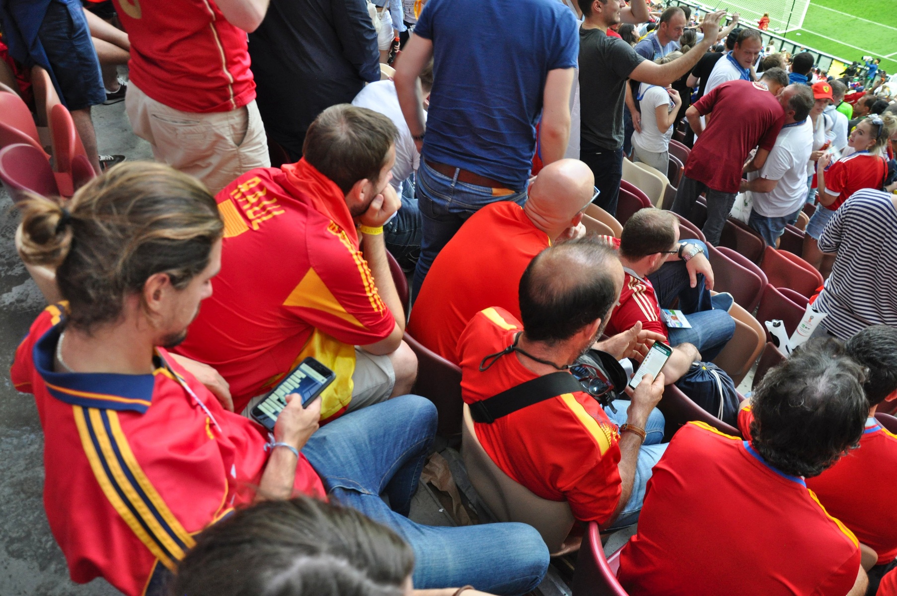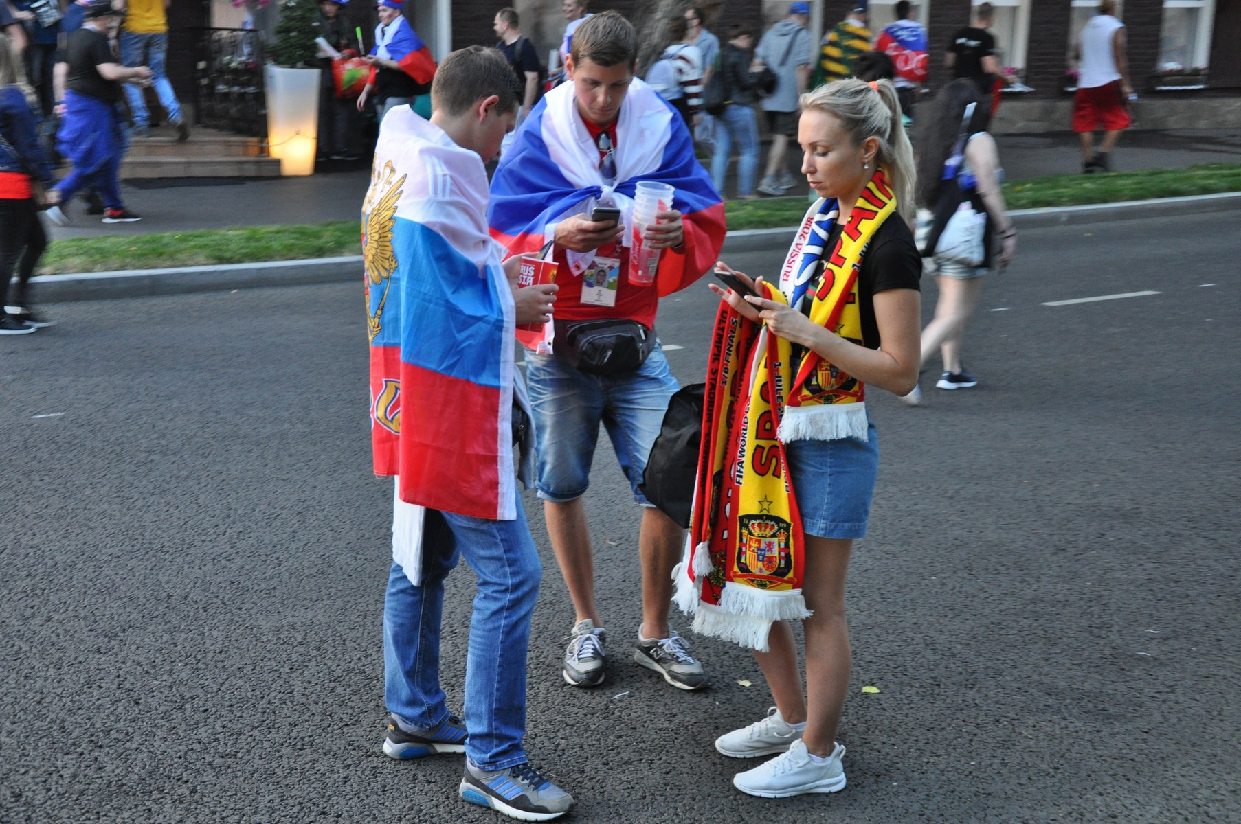 Болельщики пели песни. Обнимались, целовались. Менялись футблоками с испанцами. Последние очень быстро растворились в толпе и их вообще не было заметно.