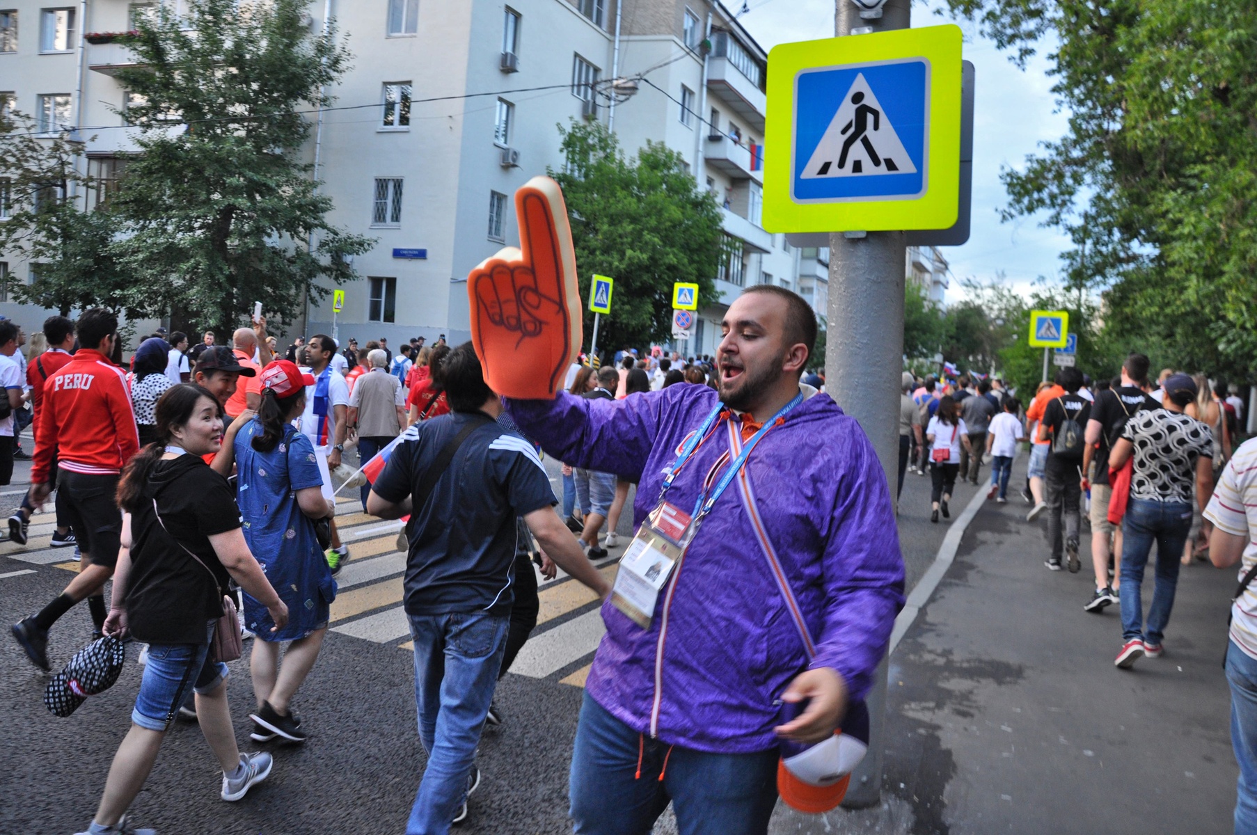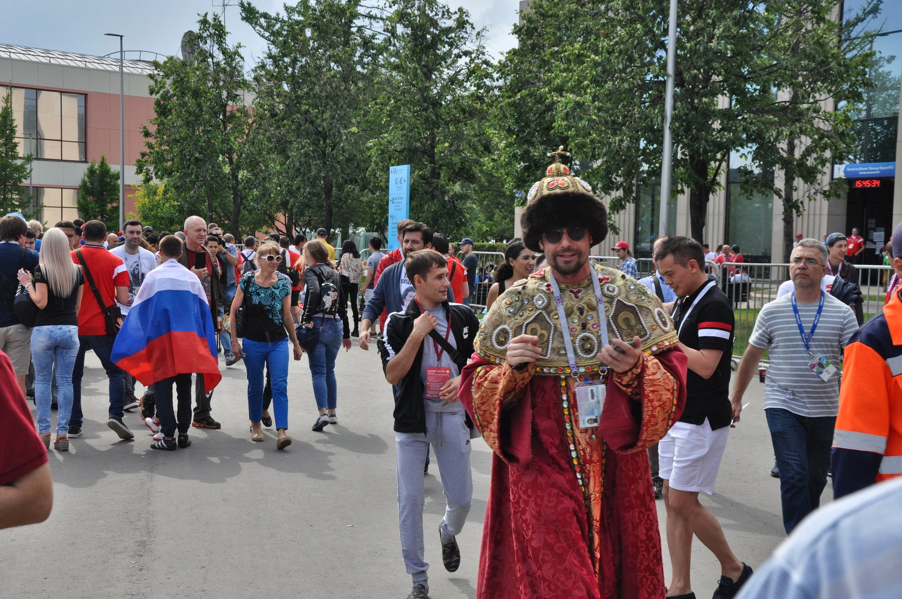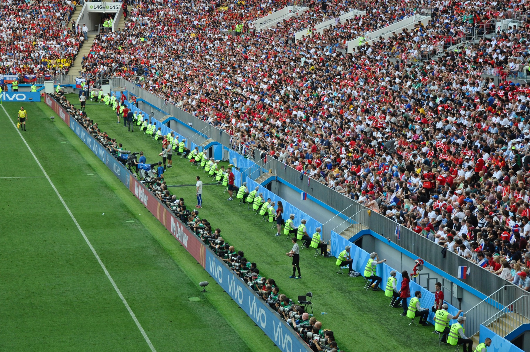Но не все пришли сюда смотреть футбол. Очень много сотрудников FIFA и волонтеров постоянно следили за порядком и хорошим настроением гостей. Больше всего не повезло ребятам в желтых жилетах. Они так и просидели всю игру спиной к полю, наблюдая за зрителями.