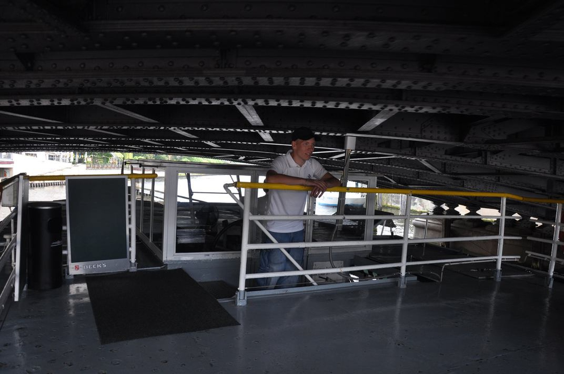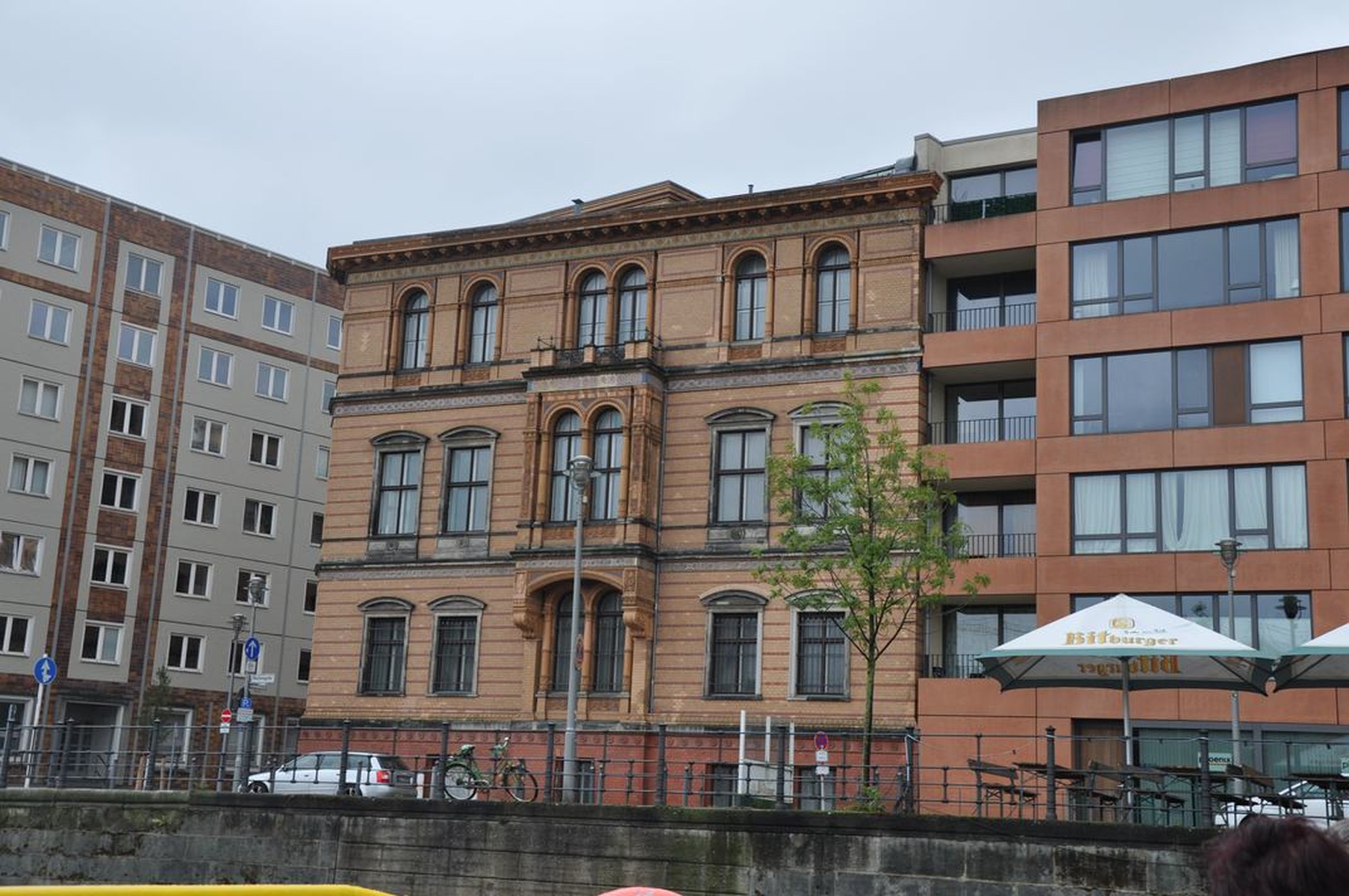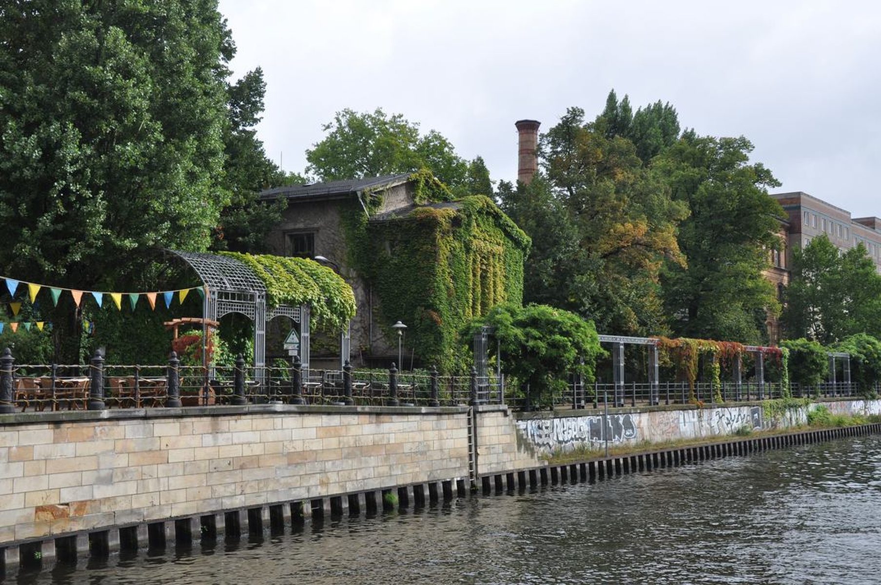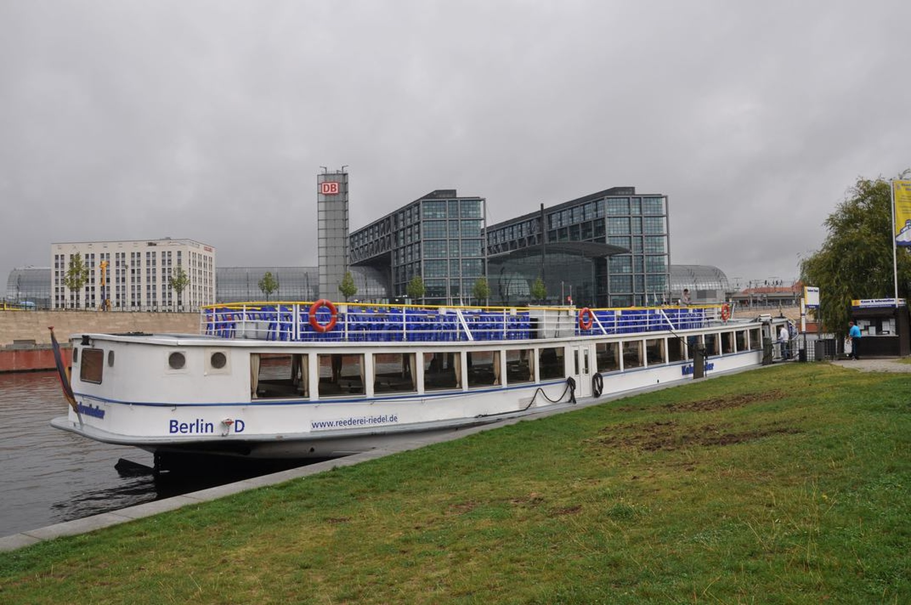 Всё было здорово, но погода в первую половину первого дня подвела: временами был мелкий моросящий дождик, который вроде и не дождик, а промокаешь всё равно моментально. Но это было не сильной помехой, поэтому после поезда я направился на пристань, которая прямо около вокзала, откуда раз в полчаса отходит небольшой кораблик с мини-экскурсией по центру Берлина. Стоит отметить, что через реку Шпрее перекинуто множество мостов, под которыми с места было лучше не вставать: