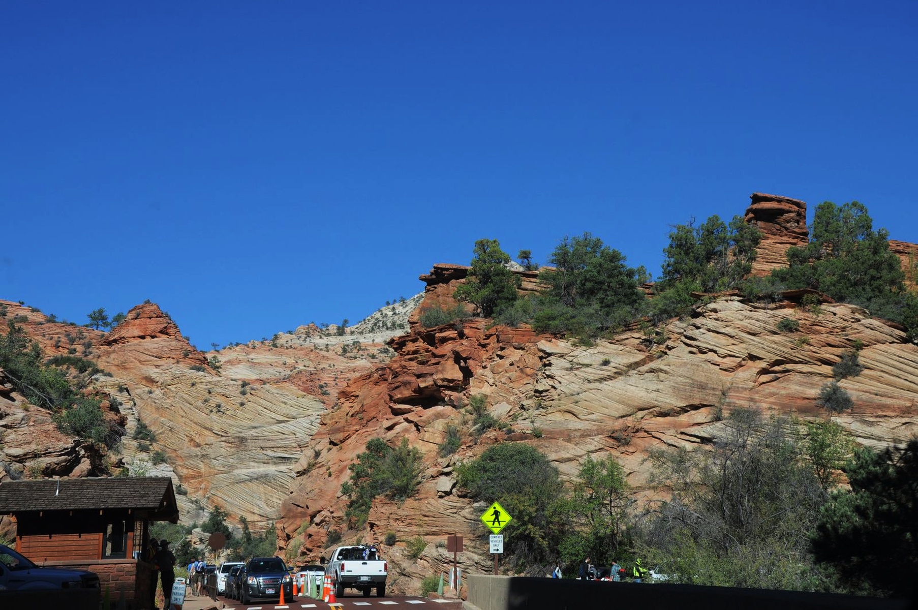 Первым делом мы попали в Zion Canyon National Park. Что сразу хочется отметить, так это насколько обустроены подобные национальные парки: на входе стоит будка, где дружелюбный сотрудник парка собирает плату за осмотр (впрочем, нам повезло, и день, когда мы туда поехали, оказался свободным для посещения), выдаёт подробную карту и отвечает на любые вопросы. Сам парк очень чистый, ухоженный. За отдельную плату там даже можно разбить палатку и переночевать. Да и оплата вполне приемлемая: от 5 до 25$ на человека ( зависит от парка ), либо 80$ годовой пропуск во все парки.