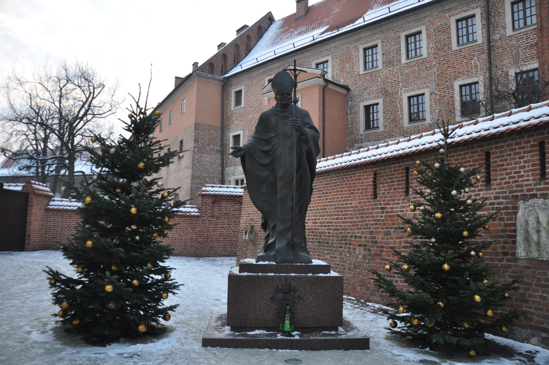 Совсем недавно папой был Иоанн Павел II, который по происхождению был как раз поляком. Поэтому в Вавеле можно встретить небольшую статую. Как раз напротив Вавельского Собора Святых Станислава и Вацлава.