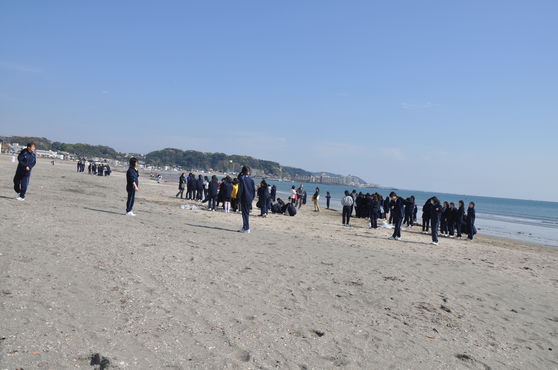 Вообще Камакура находится на самом берегу океана и в ясную погоду с берега можно увидеть гору Фудзи, но, увы, погода была пасмурной и гору не было видно. Зато была прекрасно видна экскурсия (или урок физкультуры?) на самом берегу у японских школьников.