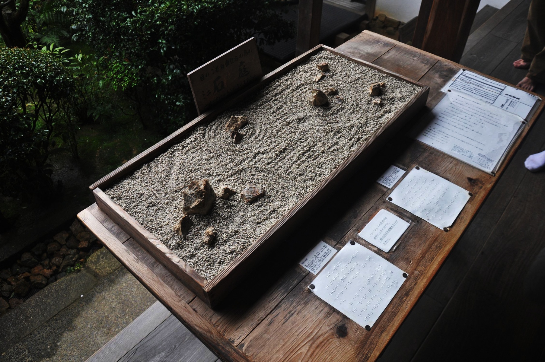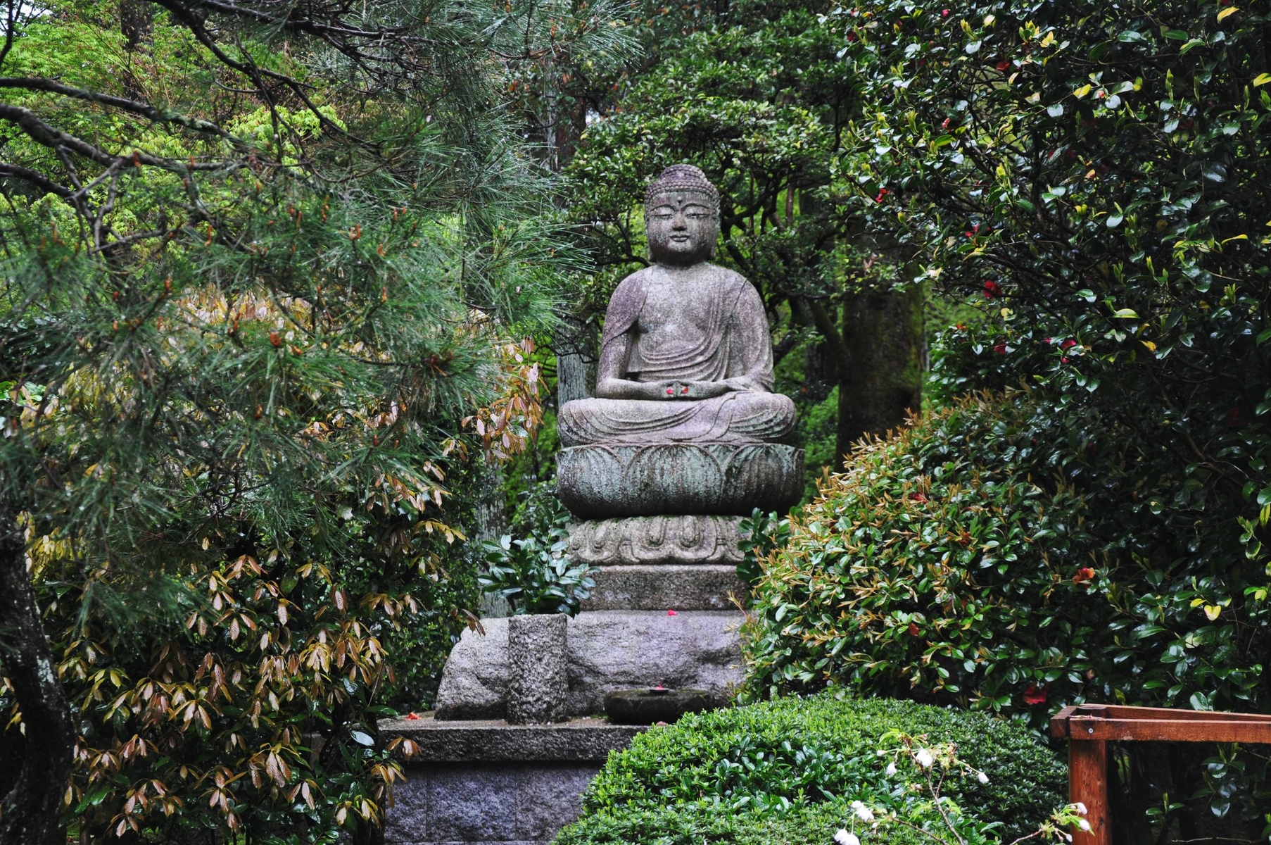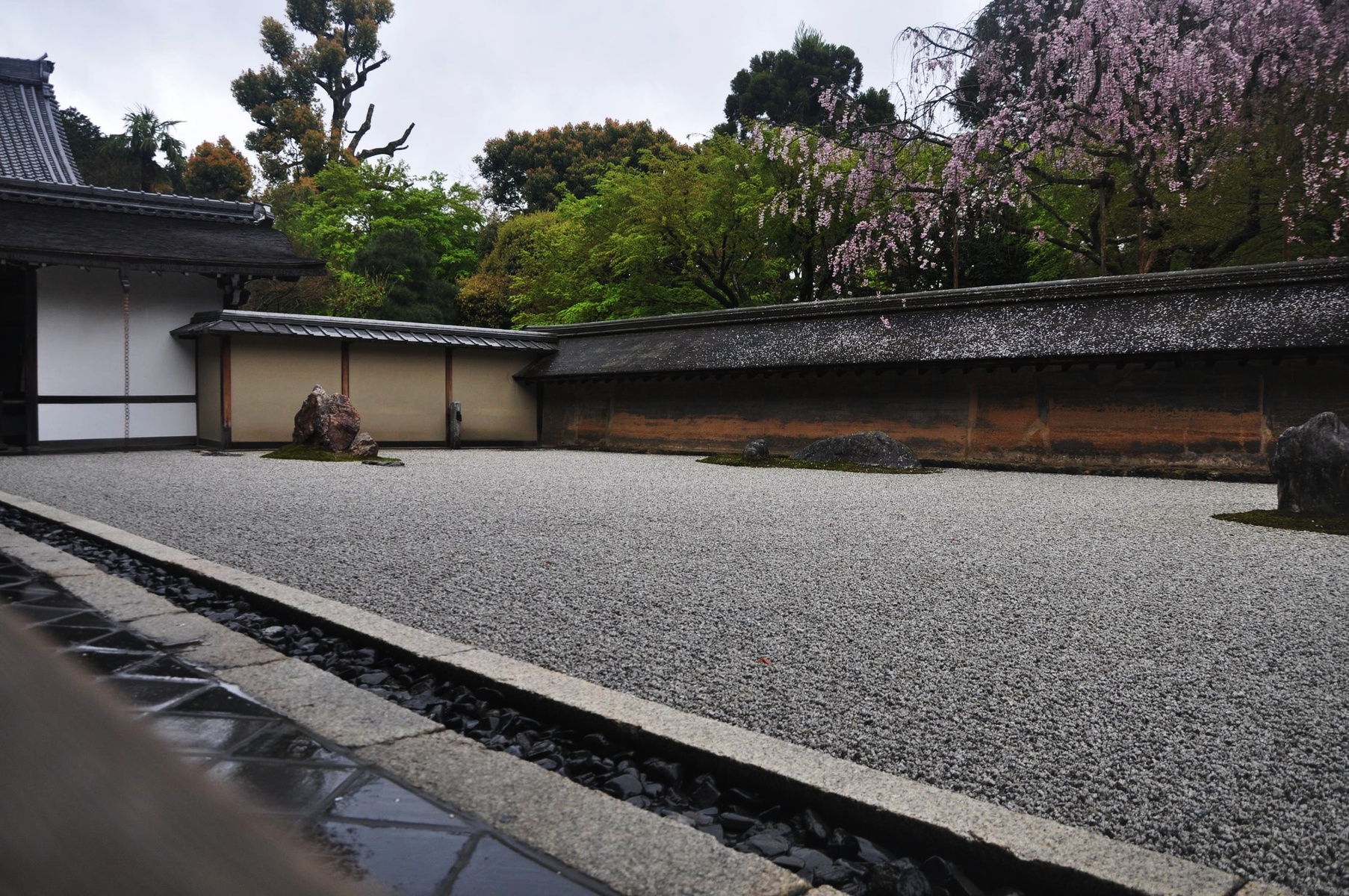 Японцы просто удивительно количество сил и труда вкладывают в подобные сады и монастыри. Один из подобных примеров — сад камней. Всего лишь 15 камней, но с какой точки не посмотри на этот сад, все 15 камней сразу увидеть не получится. Обязательно какие-нибудь камни прячутся за другими или сливаются друг с другом. Самое оно для медитации и раздумий.