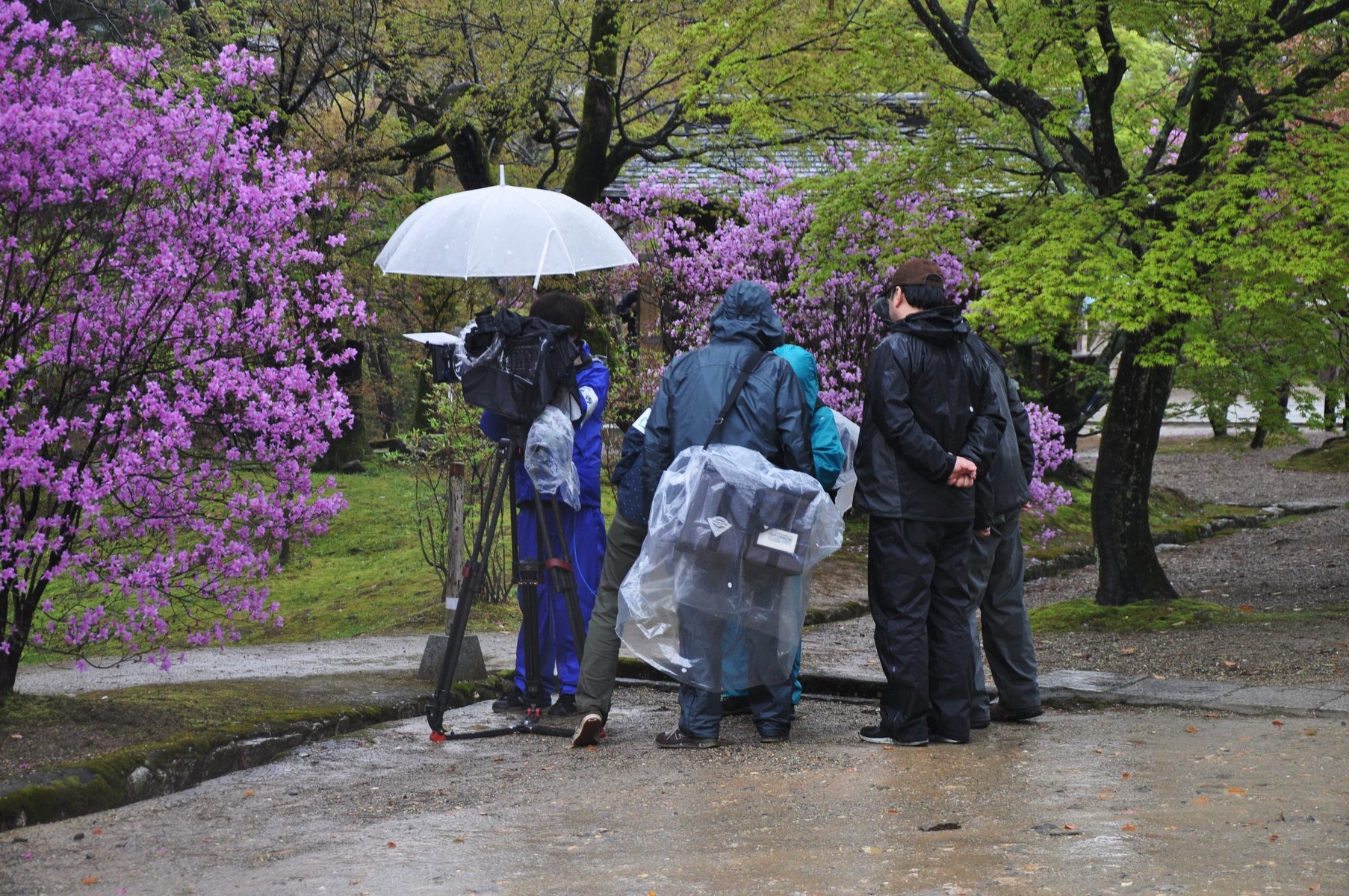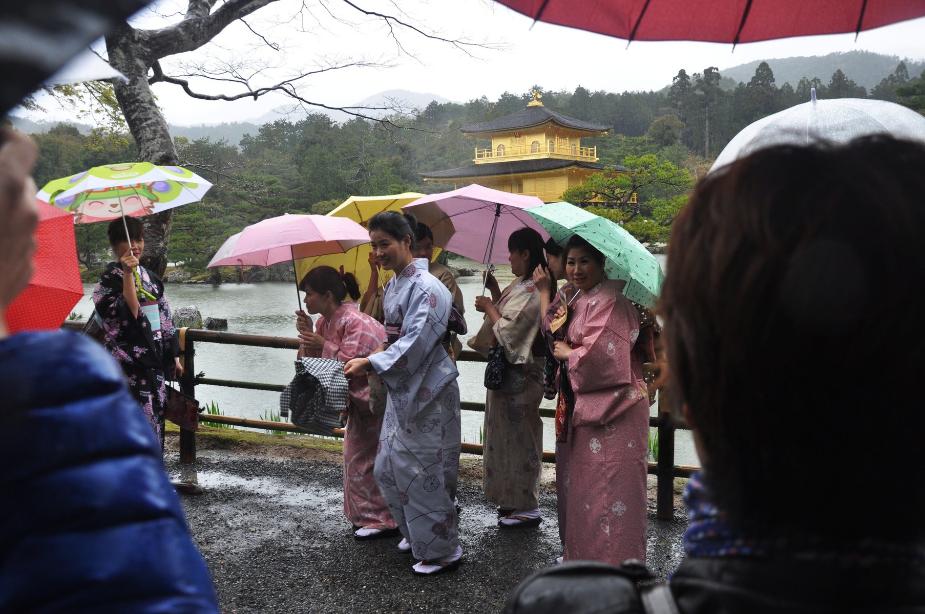 Однако туристов плохая погода явно не пугает. И даже для фотосессии в костюмах гейш храбрые женщины мужественно позируют и улыбаются под проливным дождём.