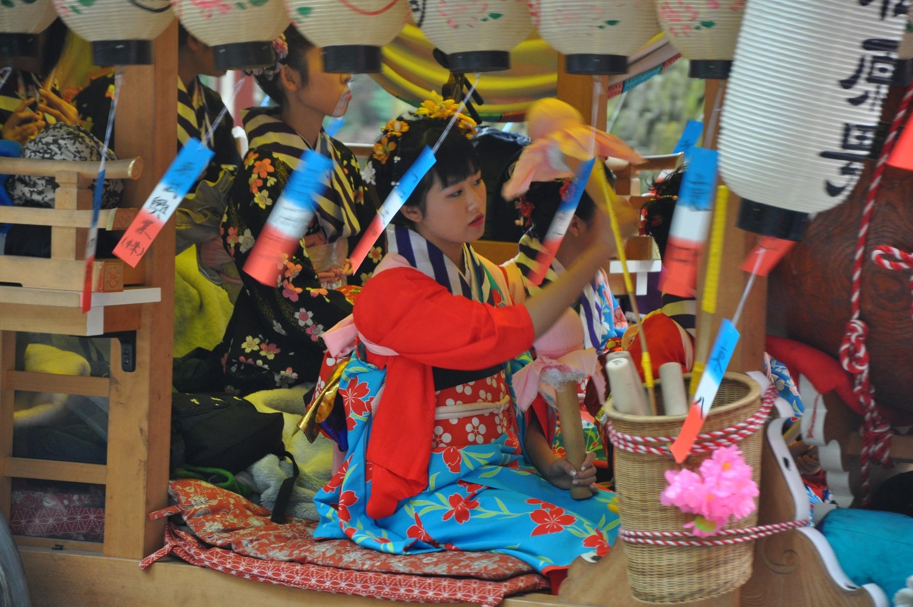 В каретах сидели молодые девушки и играли японскую музыку на барабанах. Впрочем, немало маленьких девочек, одетых в традиционные наряды, сопровождали шествие пешком.